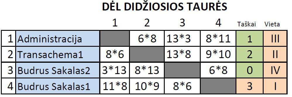 Varžybos taip susiklostė, kad prizines vietas lėmė tik paskutinieji vakaro susitikimai, kuriuose dėl III v. susitiko Budrus sakalas2 ir Administracija. Čia pajėgesnė buvo pastaroji, laimėjusi šias rungtynes prieš ,,Sakaliukų“ antrąją komanda rezultatu: 13:3.