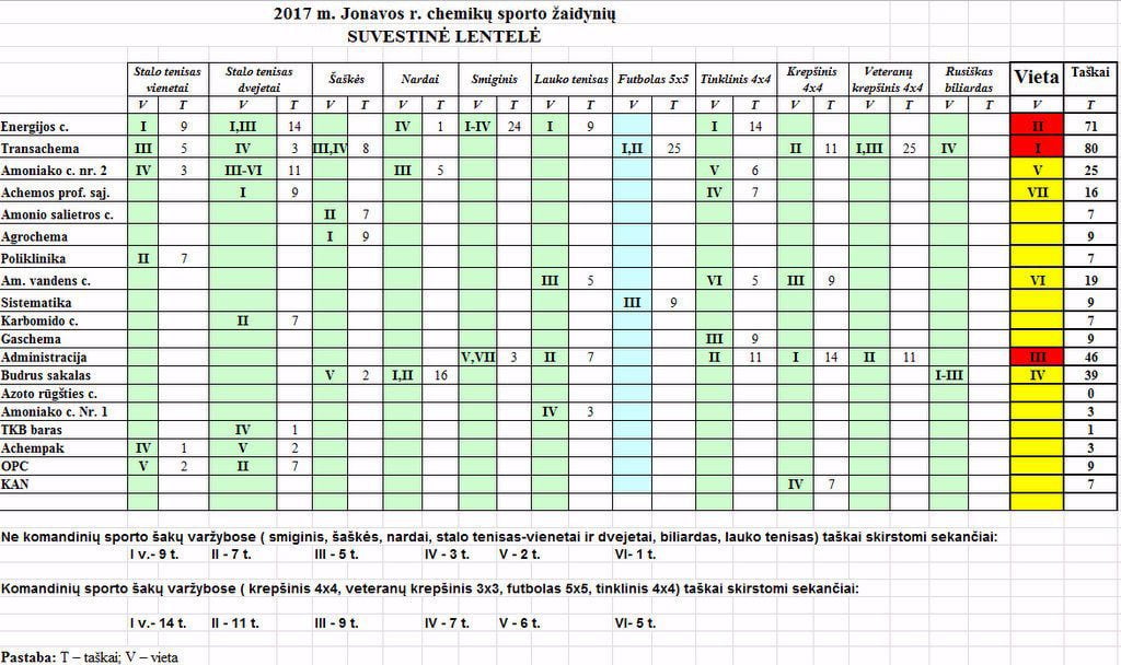 Finišavo 2017 m Jonavos chemikų sporto žaidynės, kuriose dalyvavo koncerno ,,Achemos grupės” įmonių darbuotojai. Buvo suorganizuota 11 turnyrų: stalo teniso vienetų ir dvejetų, nardų, šaškių, futbolo 5×5, lauko teniso vienetų, smiginio, tinklinio ir krepšinio 4×4, veteranų krepšinio 3×3 ir biliardo varžybos.